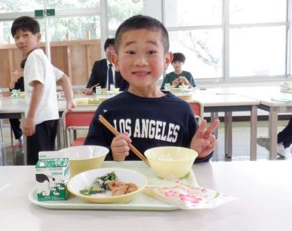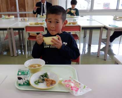 今日の給食は、1年生の入学をお祝いする献立でした。1年生も上級生も、おいしくいただきました。