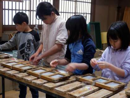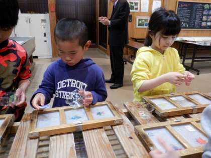 全校遠足(和紙すき体験3) 公開日 2024/05/02 更新日 2024/05/02 小見っ子ニュース すき終わったら、選んだ切り絵や文字を並べます。真ん中に置いたり、斜めに並べたり。一人一人の個性が光ります。できあがった和紙は、脱水し、乾燥させてできあがりです。
