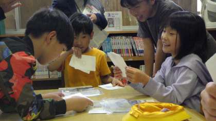 学校へ到着しました。校長先生よりお話をいただいた後、午前中に作った和紙のはがきを見合いました。すてきな作品に仕上がっています!