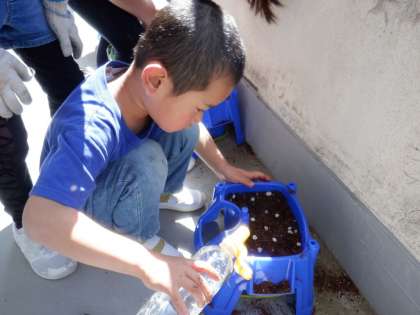 5/10アサガオの種をまいたよ 2 (1年生) 公開日 2024/05/14 更新日 2024/05/14 1・2年生 鉢の準備をして、種をまきました。指で開けた穴に、一粒ずつそうっと種を入れて土をかぶせました。芽が出るのを楽しみにしている1年生です。