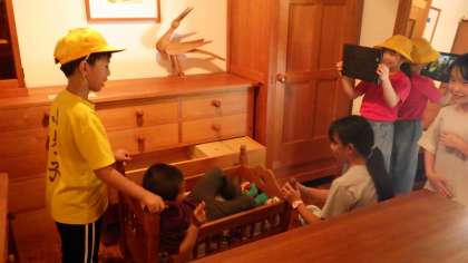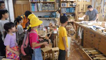 KAKI工房では、工房で作られた歴史ある家具に触れたり、木材について教えていただいたりしました。実際に家具を作っている部屋も見せていただき、関心を持って話を聞いていました。
