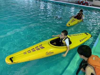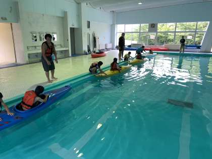 プールで乗ってみます。ペアで協力して上手に乗っています。