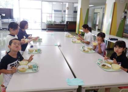 午前中の学習をがんばった1・2年生。給食の時間は、2年生が献立や給食のめあてを紹介してくれました。給食中のBGMも、相談して決めました。