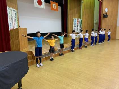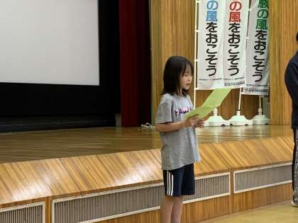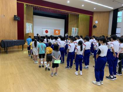 朝の集いで、同宿校に昨日行った活動の紹介をしました。
