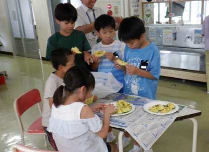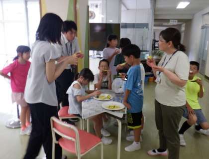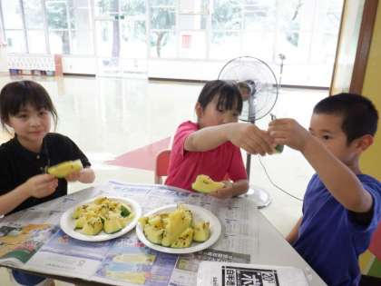 農園で収穫したスイカを食べました。黄色いスイカを食べるのが初めての子もいて、興味津々でした。おいしかったので、上級生や先生方にもおすそ分けしました。