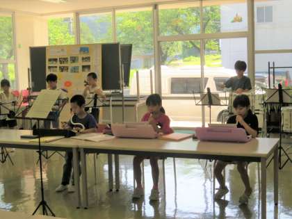 全校音楽では、運動会の開会式に向けて鼓笛隊でファンファーレを練習しています。今までは、パート別に練習をしていましたが今日初めて全員で合わせてみました。リズムや出だしの演奏の仕方を確認しました。