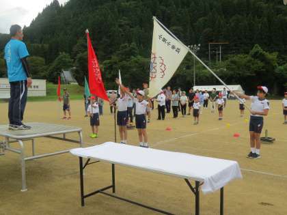 今日は、小見地区秋季運動会を開催しました。息を合わせたファンファーレ、団長たちの力強い選手宣誓、そして小見っ子全員でのゴーゴーゴーの合唱で雨雲を吹き飛ばし、その後の競技を無事行うことができました。