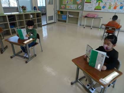 入学式翌日、1年生は国語の教科書を見てみました。「いいてんき」の詩の挿絵を見て、気づいたことをたくさんお話ししました。