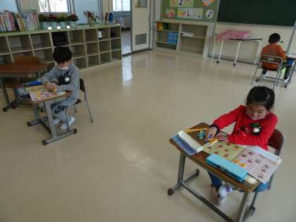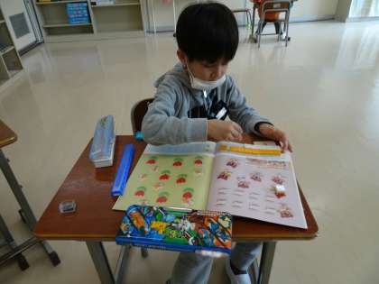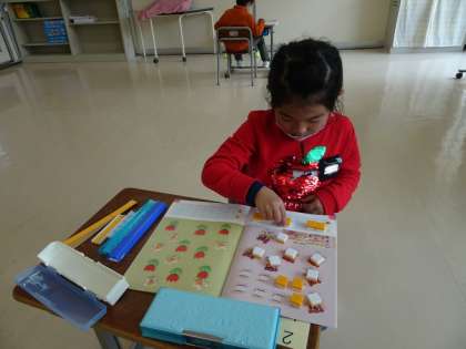 1年生は、算数の時間、算数ブロックを使って学習しました。くまが全員いすに座ることができるか、ちょうが全員花にとまることができるかについて、ブロックをならべてたしかめました。