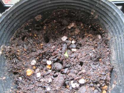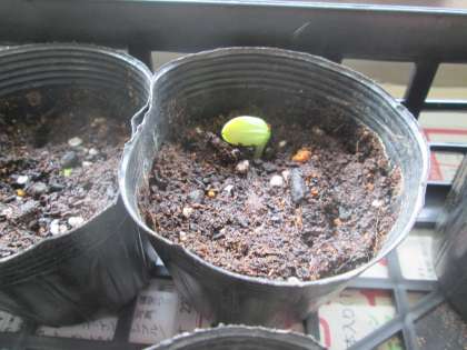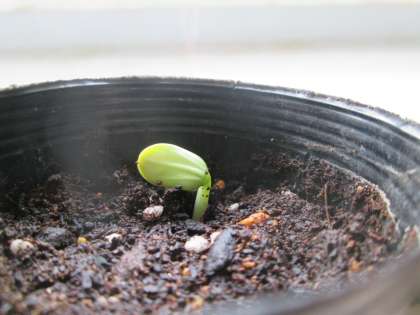 13日に植えたヘチマの種から5月20日、芽が1つ出ました。となりのポットも芽が出そうです。