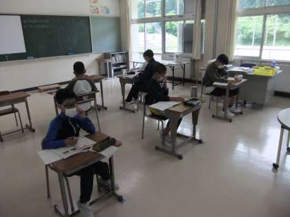 さっそく授業が始まりました。教室でもソーシャルディスタンスを保っています。