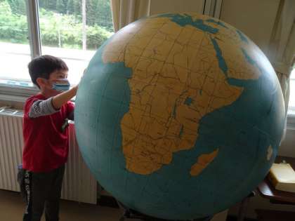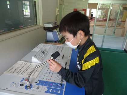 生活科の時間に、校舎2階の教室を回りました。大きな地球儀に外国語の時間に使うカード、思わず話したくなる放送室のマイク。みんなの目が輝きました。