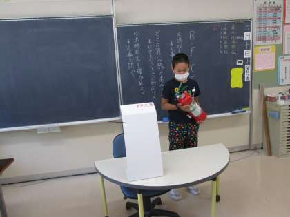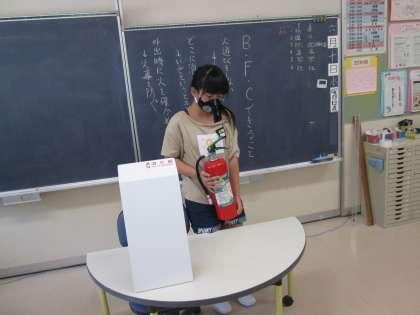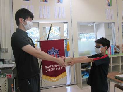 例年は、消防署の方からバッジをいただいていますが、今年度はBFCについての本を読んだり、担任から説明を聞いたりして、バッジを渡しました。