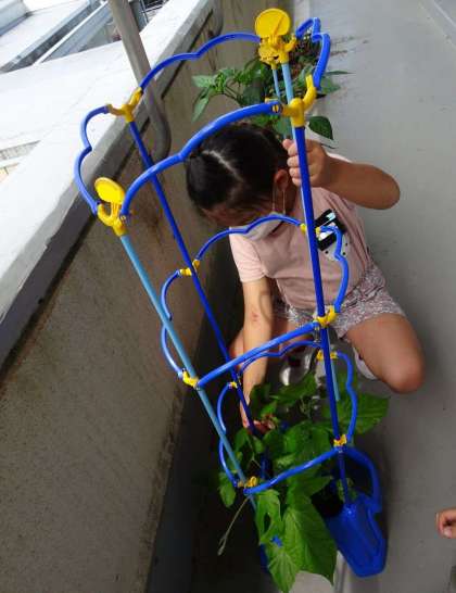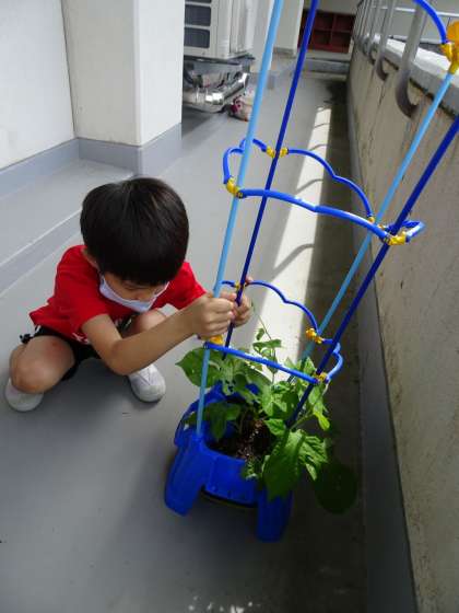 アサガオのつるが伸びてきたので、支柱を立てました。2年生が教えてくれたので、1年生も、自分で立てることができました。