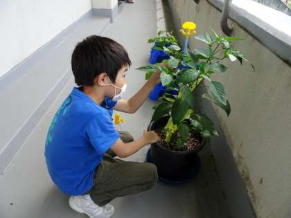 2年生は、今朝も、ピーマンに虫がついていないか、花がどのように変わっていくかを観察しながら、お世話をしました。