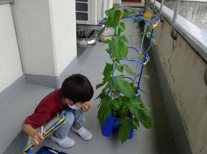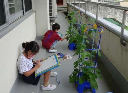 こんなに大きくなったよ (1年生) 公開日 2020/07/01 更新日 2020/07/01 1・2年生 生活科の時間に、アサガオの観察をしました。葉っぱがどれも成長し、自分の顔より大きくなっていることに驚いていました。