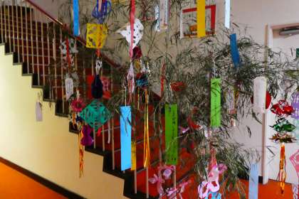 1・2年生が手作りしてくれた飾りも付けてあります。とても素敵な七夕飾りになりました。梅雨空がしばらく続きそうですが、小見っ子の願いが星に届きますように!!