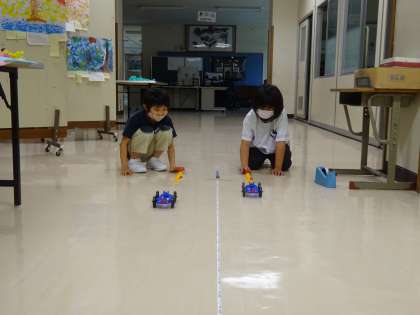これまでの経験や輪ゴムを引っ張ったときの手応えから、ゴムを長く伸ばしたり、本数を増やしたりしたら車が遠くまで進むと予想した3年生。調べた結果、予想したとおり、車が進みました。