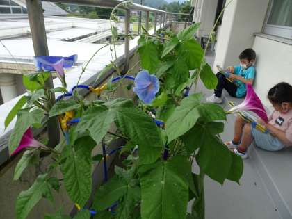 そして、まだまだつるが伸びています。支柱を越え、つかまるものを探すかのように互いのつるを絡ませながら伸びています。葉も生い茂り、ジャングルのようです。