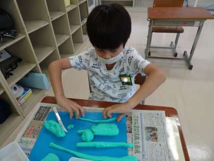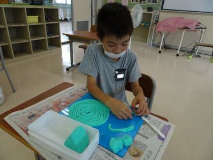 図工の時間に、粘土をひも状にのばし、いろいろな形をつくって楽しみました。巨大なヘビにペロペロキャンディ。思い思いにつくりました。