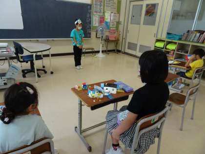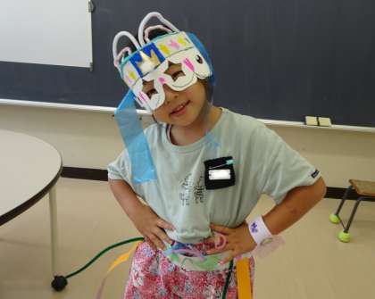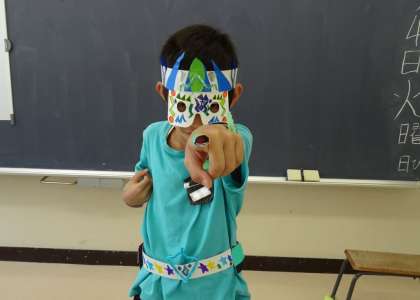 できあがった作品を身につけ、みんなで紹介し合いました。「宇宙戦士H」と「虹のお姫さま」です。