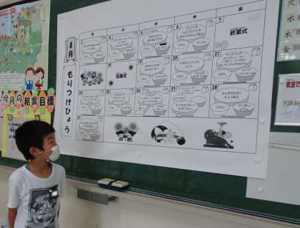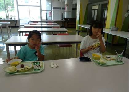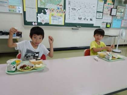 宿泊学習で、おいしそうな焼きそばを作っている上級生の様子を見て、おなかがぺこぺこの1・2年生。おいしく給食をいただきました。今日は、2年生が献立を紹介してくれました。