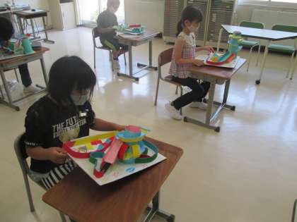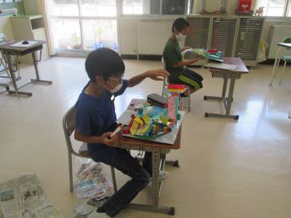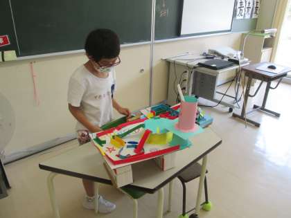 3、4年生は、先日仕上げた「コロコロガーレ」の作品の工夫したことを友達に話したり、友達の作品にビー玉を転がして転がり方を試したりしました。自分では思いつかないような友達のアイディアに感心している様子でした。