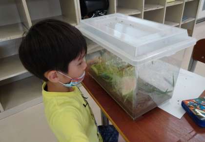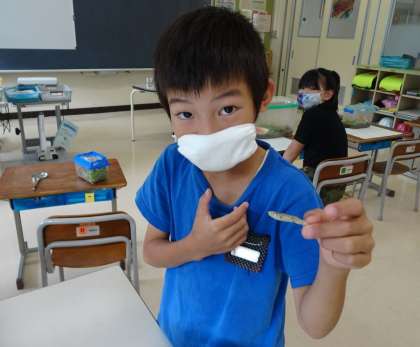 教室にいる虫さんの好物をあげようということで、コオロギのために、にぼしを持ってきた子がいます。