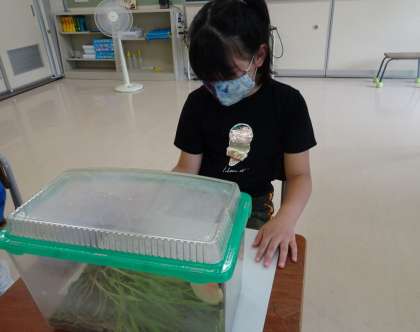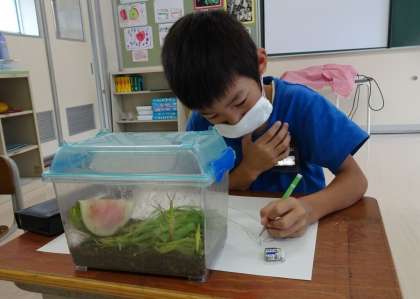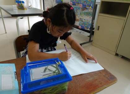 自分の虫をよく見て、絵を描いています。目や口、足の様子など、今まで気づかなかった発見があります。