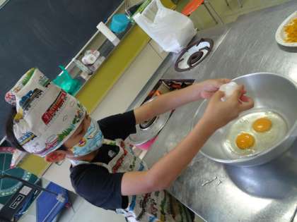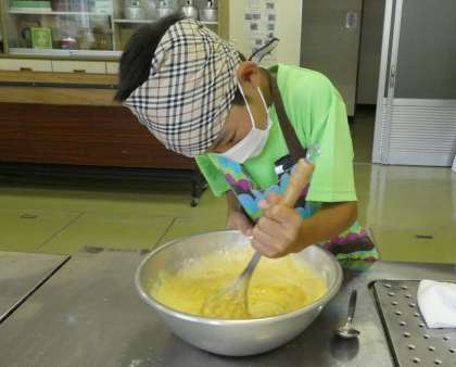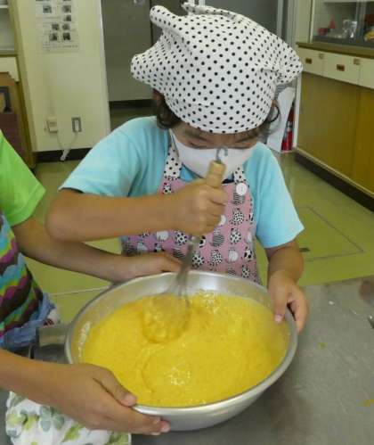 次は生地づくりです。卵も上手に割ることができました。生地にカボチャを混ぜると、黄色い色に変わります。