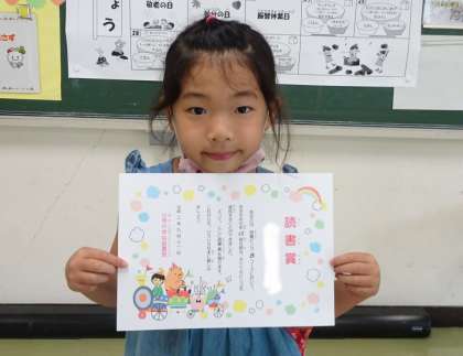 給食の時間に、読書ビンゴを達成した1年生の表彰を行いました。