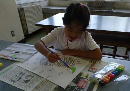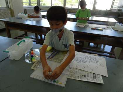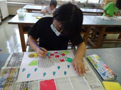1年生は、自分の水彩を使うのは初めてなので、どのくらい水を加えて塗るとよいのかをたしかめながら塗りました。