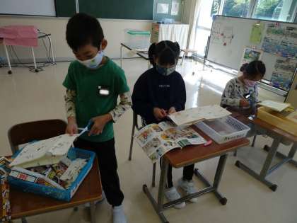 図工の時間に、細い紙をつないだりつるしたりする活動を行いました。