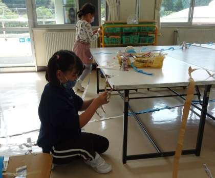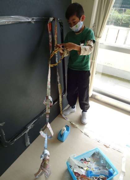 時間の後半には、自分の作った道にいろいろなものをつるすアイディアも出てきました。坂道を下るロープウエーもできました。