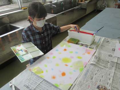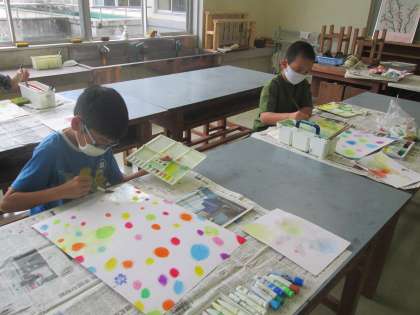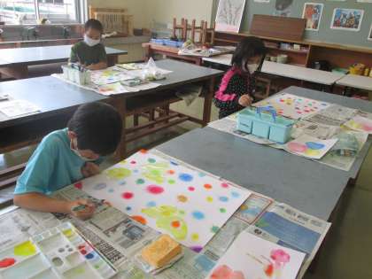 3・4年生は、図画工作科の「ことばから形・色」で、物語から想像をした様子を絵に表しています。今日は、クレヨンで光を表した回りに水彩のにじみやぼかしの技法を使って色を塗り、背景を仕上げました。どんな絵に仕上がるかはお楽しみ・・・