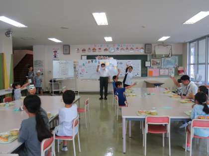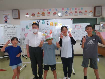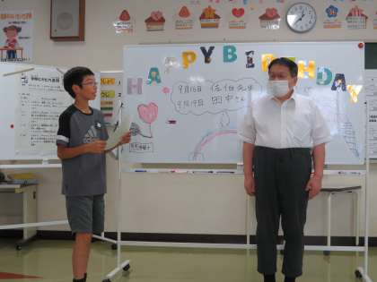 9月が誕生日の先生方のお祝いをしました。元気もりもり委員会が企画し、牛乳での乾杯やインタビューなどでお祝いを盛り上げてくれました。最後に先生方との写真も撮りました。