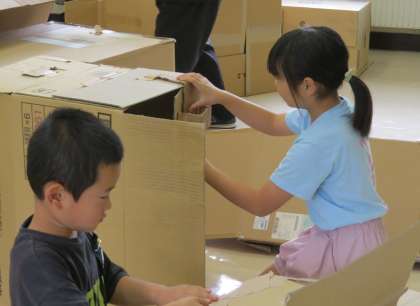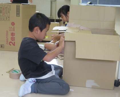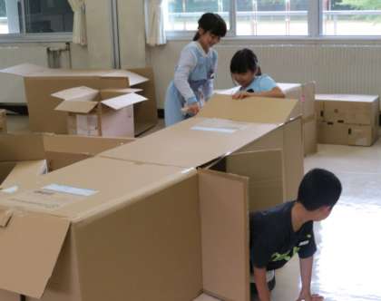 図画工作科の学習で、段ボールに入って思いついたことを試したり、作ったりする学習を行っています。段ボールをつないでトンネルのようにしたり、部屋にしたりと、ダイナミックな活動を行っています。