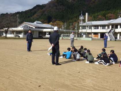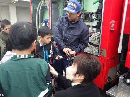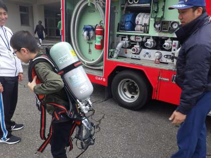 今月の避難訓練は、大山消防署小見分遣所の方にお越しいただき自衛消防訓練を行いました。地震が起こった後に、火事が起こった場合の訓練を行いました。休み時間の訓練とあり、自分たちで判断をして避難をする姿を見ていただきました。一人一人自分の命を守る訓練として、真剣に取り組んでいました。訓練の後に、消防車の見学をさせていただきました。消防隊員の方が消火活動にあたる際に使用する酸素ボンベを担がせていただき、防火の意識を高めていました。