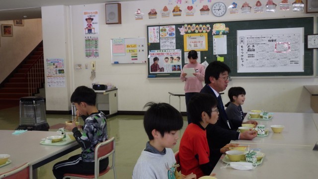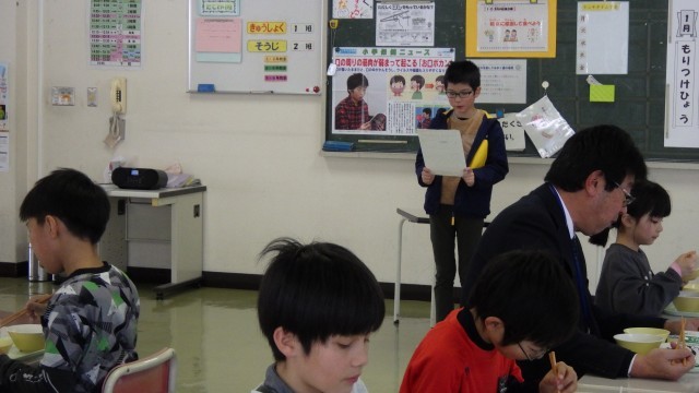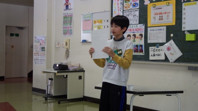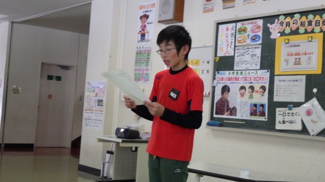 給食の時間に、1月の「できることをふやそう・じぶんのよさをみつけよう」を発表しました。スキーやメディアコントロール等にめあてをもって取り組んでいきます。