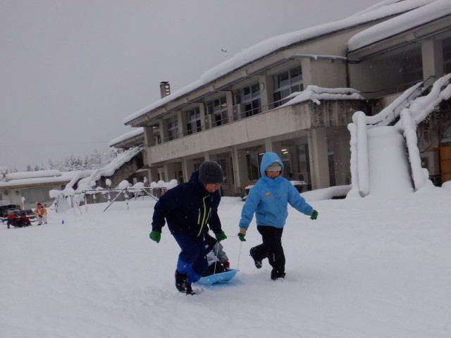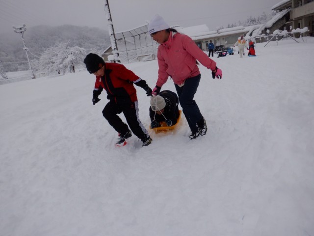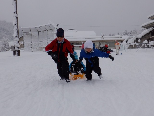 2つのチームに分かれて競い合い、ソリに乗った子が落ちないように一生懸命引っ張りました。