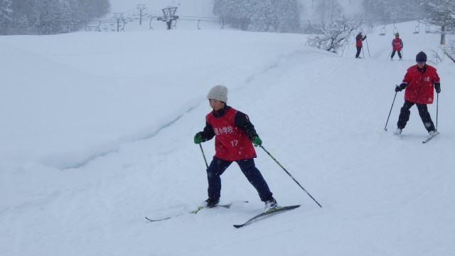 校内スキー大会のコースを実際に滑り、本番を意識した坂下りやカーブの練習などをしました。
