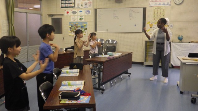 ジェスチャーをしながら、リズムよく友達やALTのNdango先生と質問し合いました。