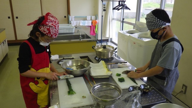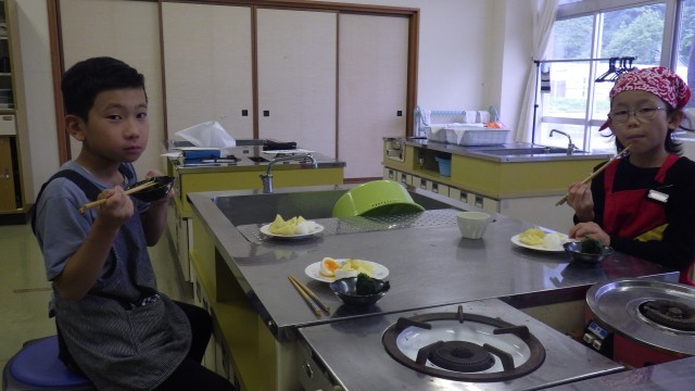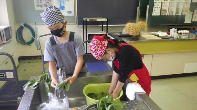 5年生は、ゆでる調理に挑戦しました。青菜(ほうれん草)と、じゃがいも、卵をゆでました。じゃがいもは時々竹串を使ってゆで加減を確認したり、ゆでる前とゆでた後の野菜の色やかさなどを観察したりました。