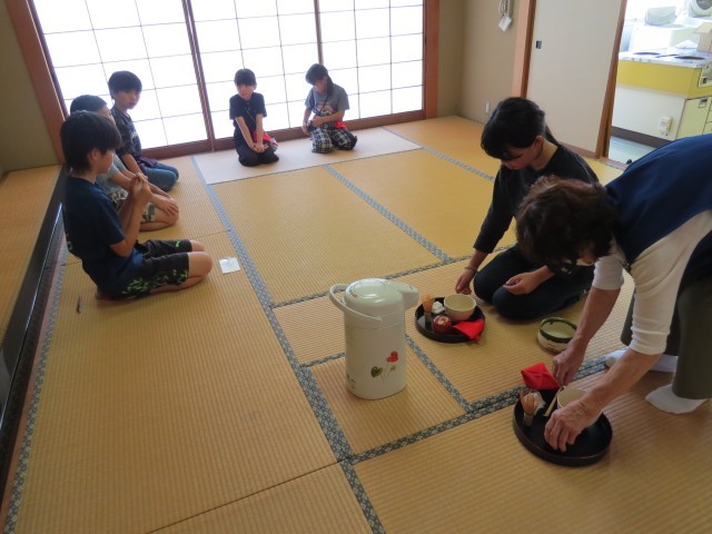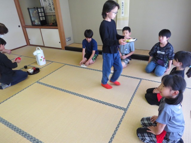 6年生が講師の先生から丁寧にお手前を仕方を教わり、3~5年生がお運びの練習をしました。