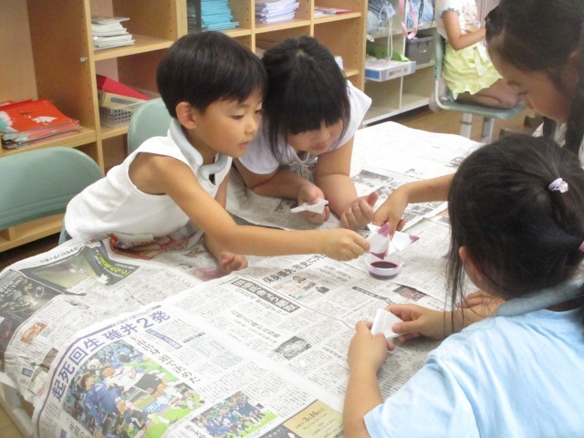しぼんでしまった花を摘んで、色水づくりを行いました。袋に入れて揉むときの感触やできた模様を楽しんでいました。