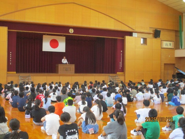 校長先生からは、熱中症に気を付けて生活することや学習に取り組む姿勢等についてお話がありました。学習については「基礎基本を大切にして、気になったことはクロムブック等を使って自主的に調べていこう」とお話がありました。