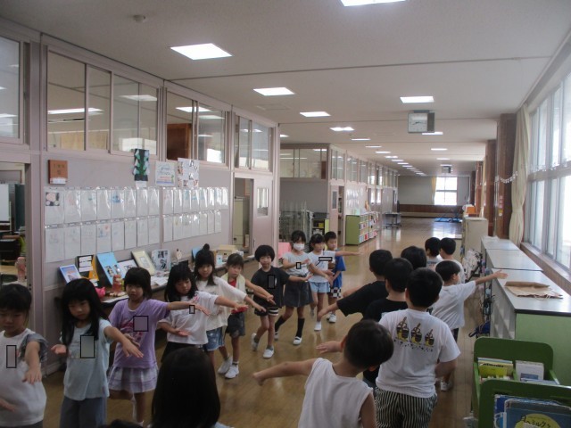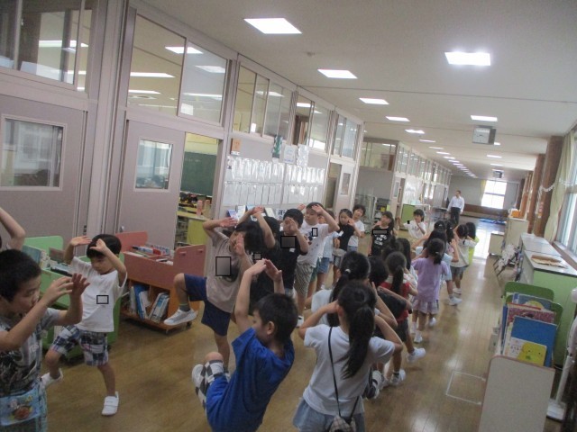 今日は、1年生だけで輪になって踊りました。ポーズをかっこよくきめる姿、視線や体の使い方まで意識して踊る姿、手と足の動きが揃うようになってきた姿。それぞれに成長を感じた最終日でした。