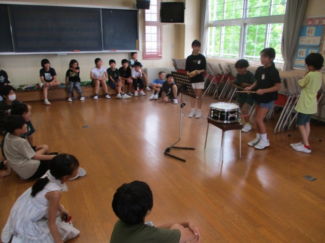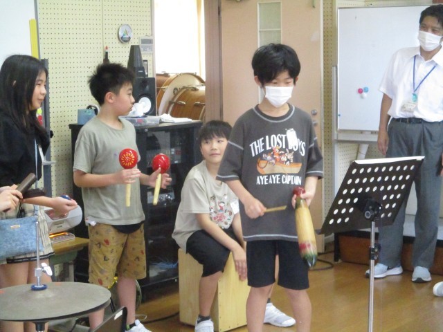 自分たちでリズムを決め、リズムアンサンブルを行いました。さまざまな楽器に触れ、試しながらリズムに合う楽器を選びました。いろいろな楽器の音色の重なりを感じながら、演奏しました。