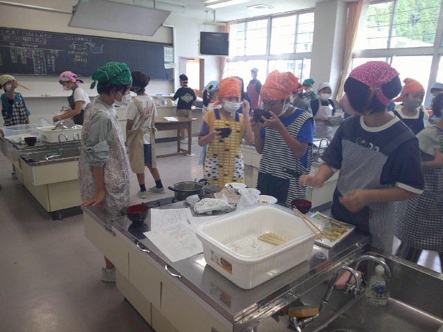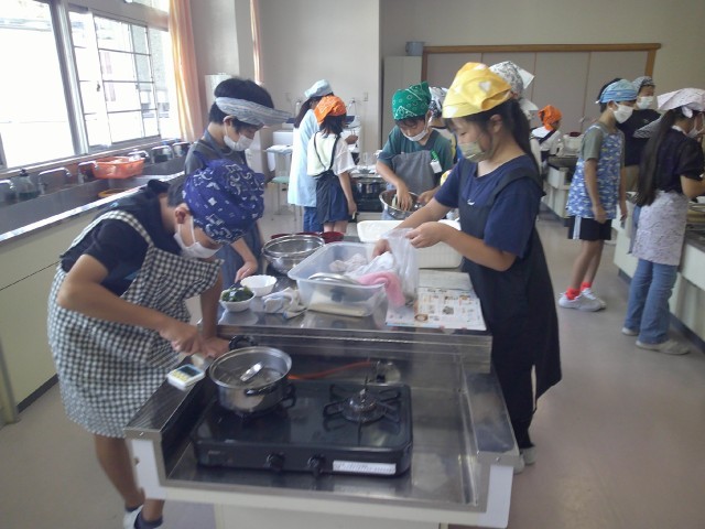 調理実習で「お味噌汁」を作りました。にぼしで出汁を取り、各班で決めた具材を煮込んでおいしいお味噌汁が仕上がりました。メンバーで分担しながら協力して活動することができました。