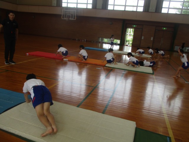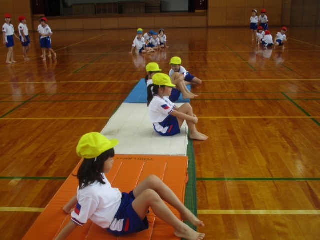 クマ歩きやアザラシ歩き、カエル跳びなど、動物になりきってマット運動を行いました。